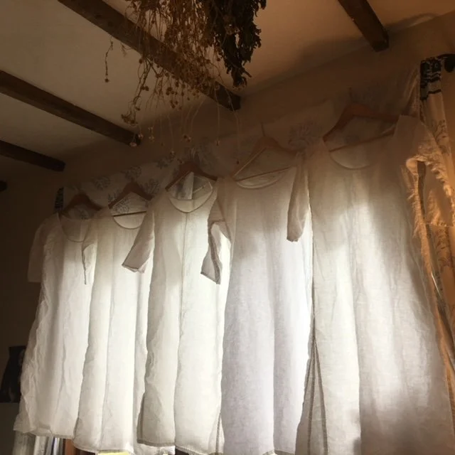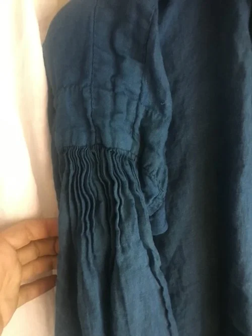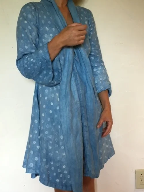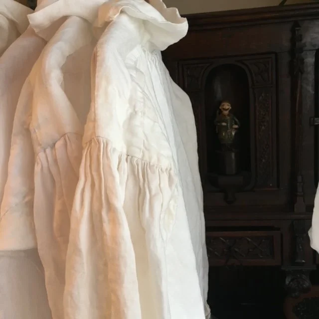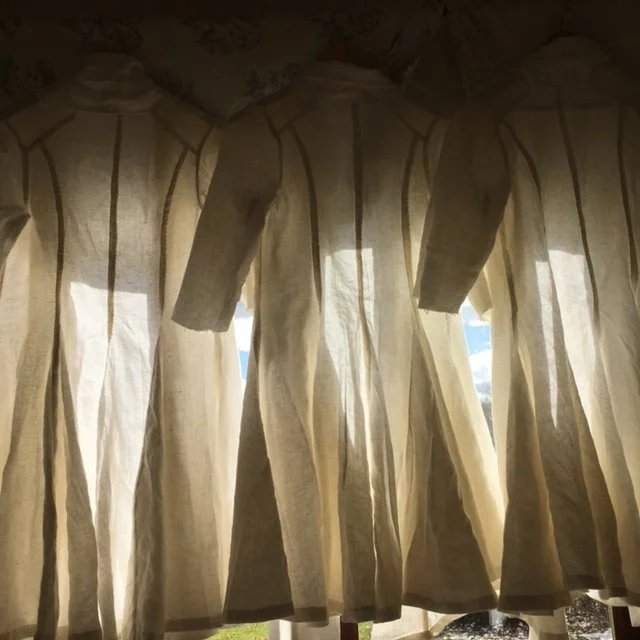 Linen dyed with natural pigments, 17th and 18th century patterns. Along with shoes, I work to pull select garments and accessories out of paintings and books.