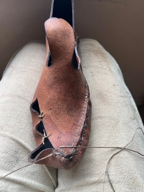 I was able to produce Irish Brogues due to the archeological research of A.T. Lucas with Harvard Expedition proceedings of the Royal Irish Academy. The bog in which the shoe was found was dated “as early as 200 AD” The earliest example is found in writing is found in a 5th century Irish text . Brouges are a turned shoe meaning they are stitched “inside out” and turned “right side out” All shoes are sewn with hand twisted and waxed thread with wild German boar hair as needles.